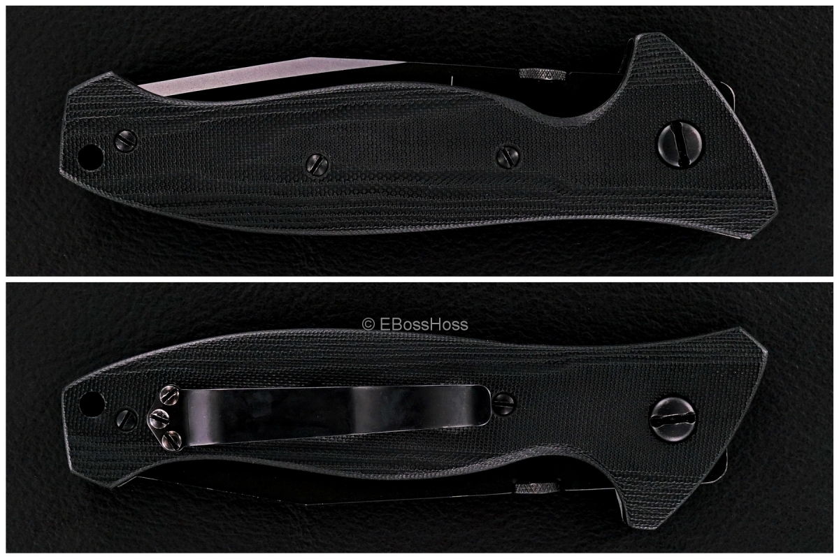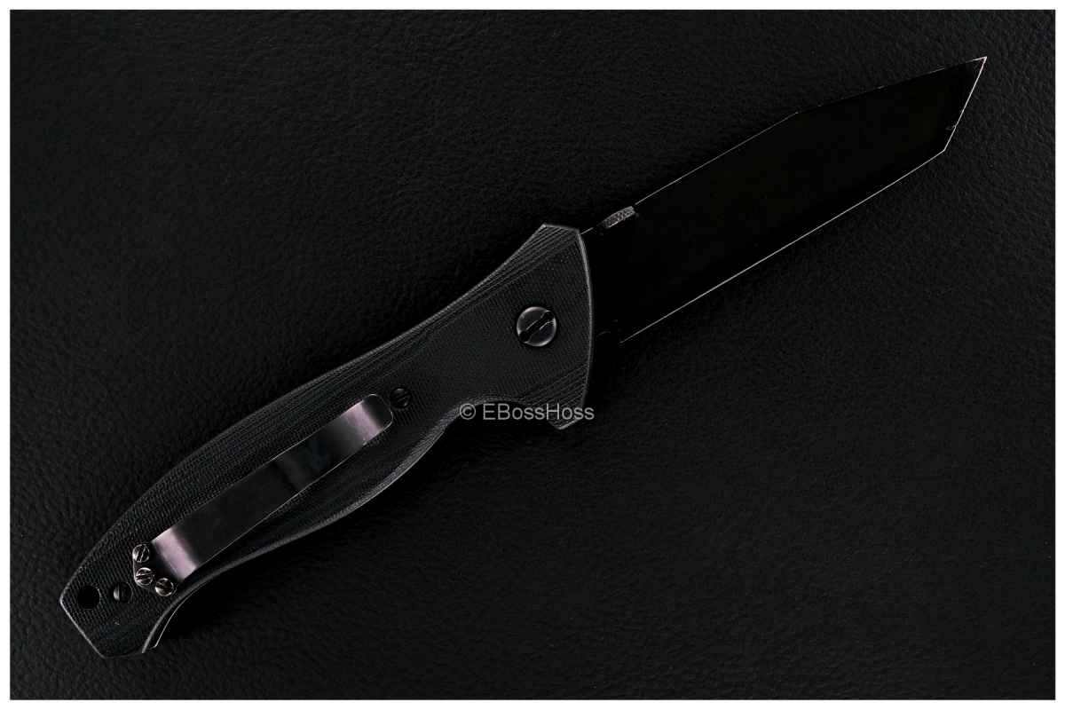 "A Prototype made by Ernie when he was setting up his production knife company. This is the actual proto for his second knife, the SpecWar. It has the extremely rare black coating on a custom knife, and the even rarer black coated titanium liners. Hand contoured black micarta scales and the rarely seen black steel straight edge clip. This one is completely unique because it is about 20% larger than the production version that EKI made. It also has the only known use of split pivots, a design Ernie was trying out. It shows some light use, probably by a military user testing it out. This knife was designed for military use. It is also very important in the history of Emerson Knives. JBravo on the USN, Recognized Worldwide Authority and Historian on Ernie Emerson Knives"