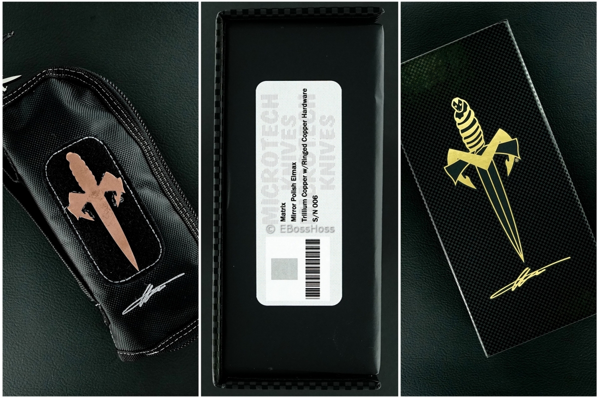 • Marfione Packaging including Titanium Certificate of Authenticity, Logo-ed Zipper Knife Case, Velcro-backed Copper Dagger Patch, Titanium Dagger Bead, and a Marfione Custom Knives Logo-ed Box to Carry it All!