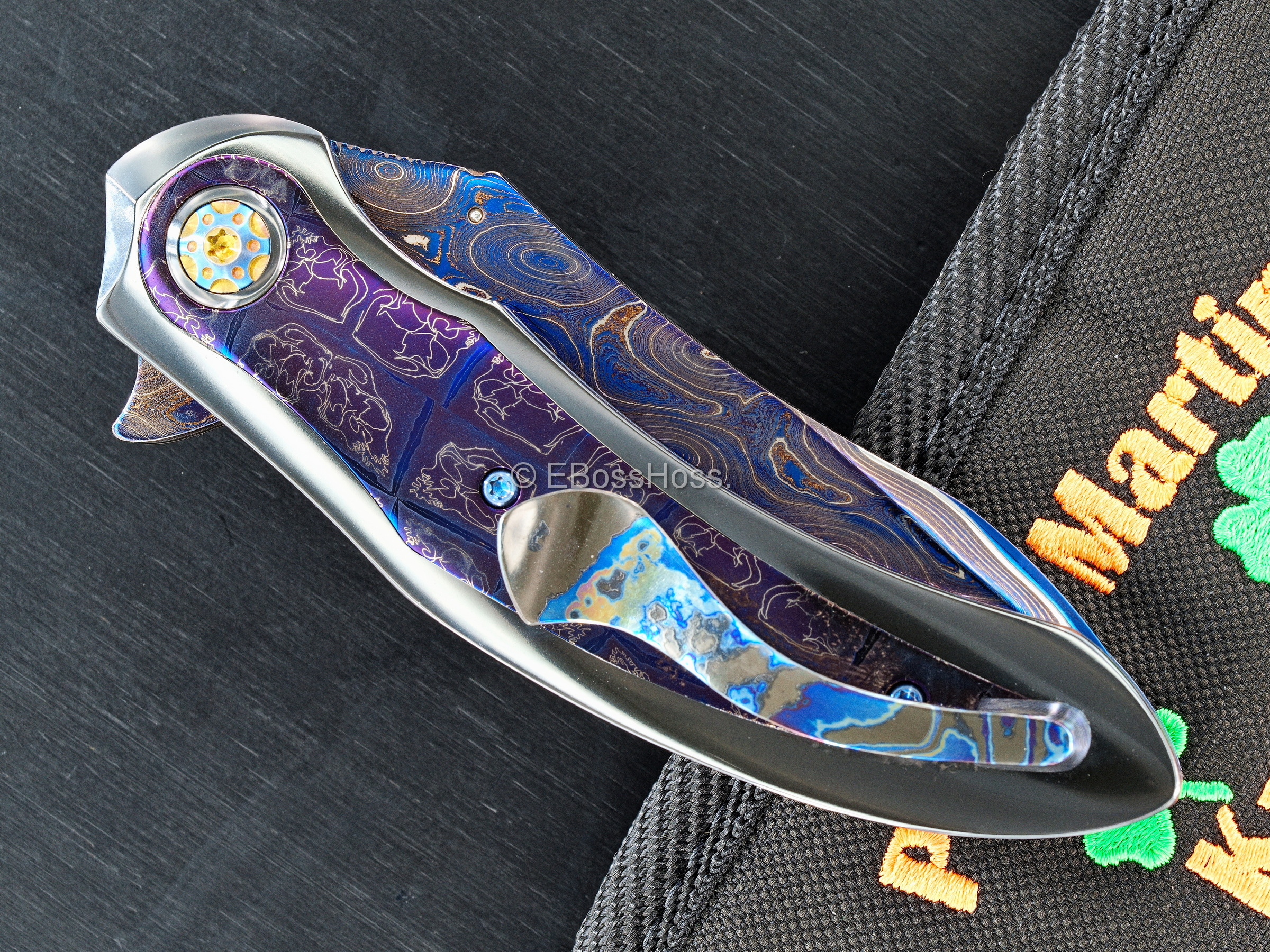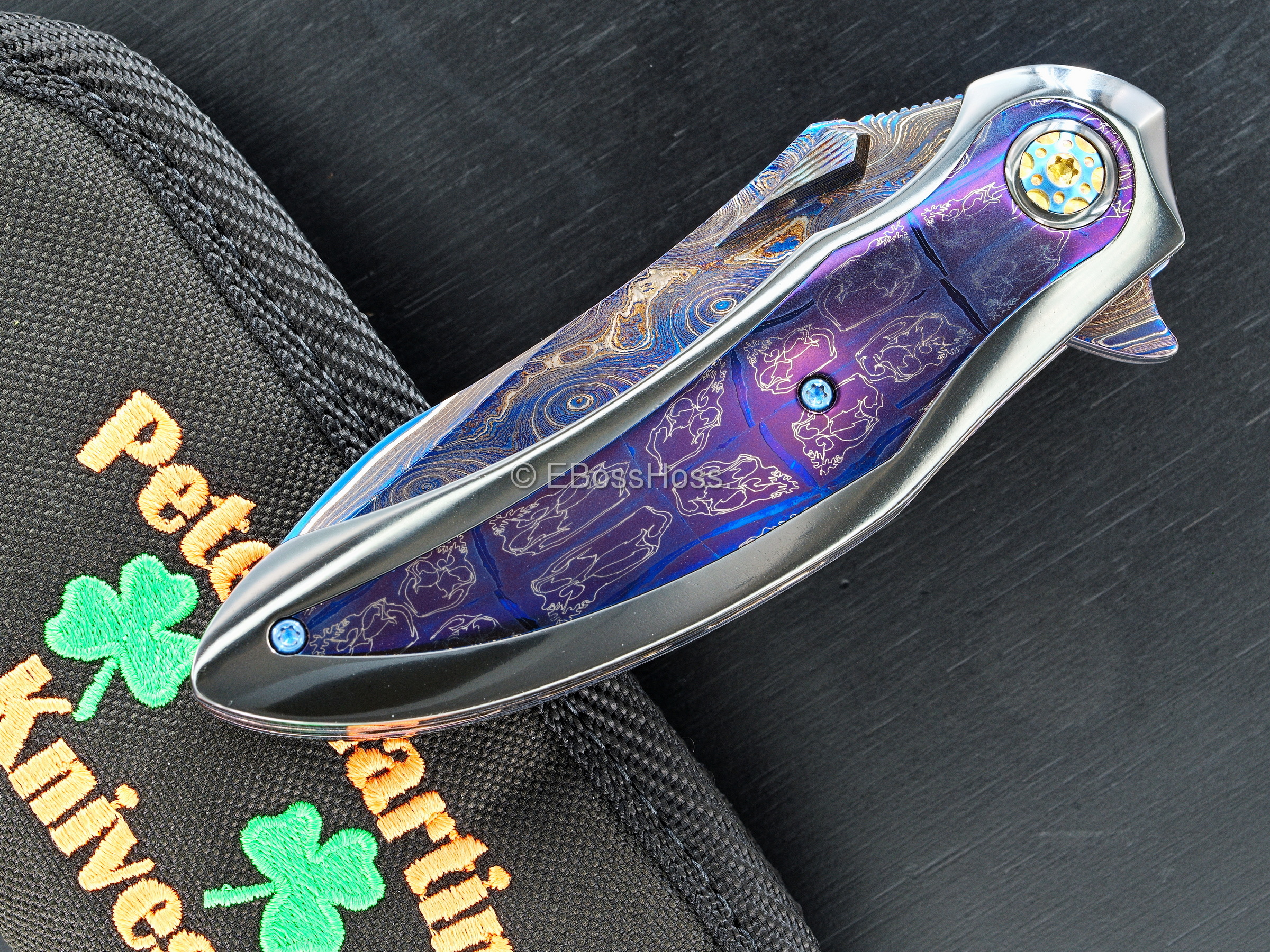 - Exquisite and Thick, Sculpted and Contoured High-Polished Zirconium Handles with Peter's Skull-Damascus Inlays