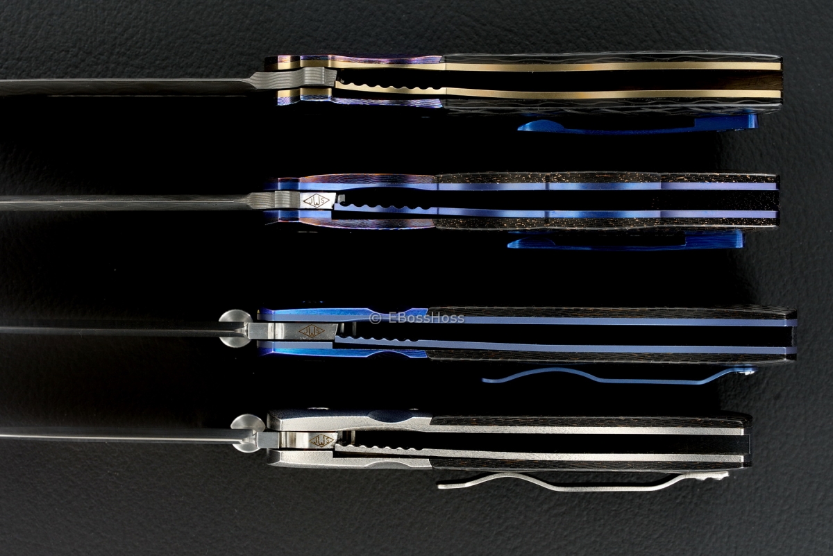 - SOLD - John W Smith (JWS) Deluxe Large Bolstered Damascus Tactical Flipper (bottom knife); Timascus Bolsters & Pocket Clip, Cross-cut Random-pattern Carbon-Fiber Scales, 3 7/8" Blade, 8 13/16" OAL; Mint